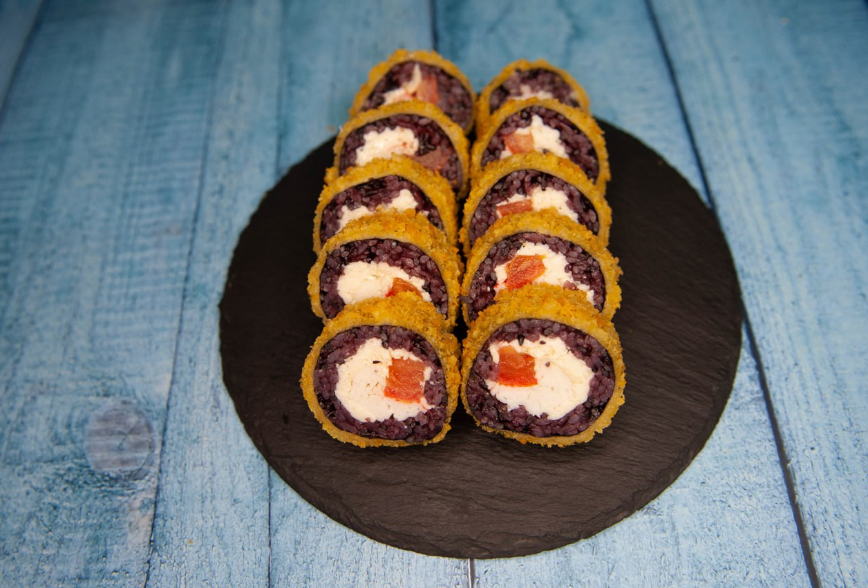 Рис, нори, бекон, краб имитация, творожный сыр, огурец, соус спайс, соус унаги, кунжут