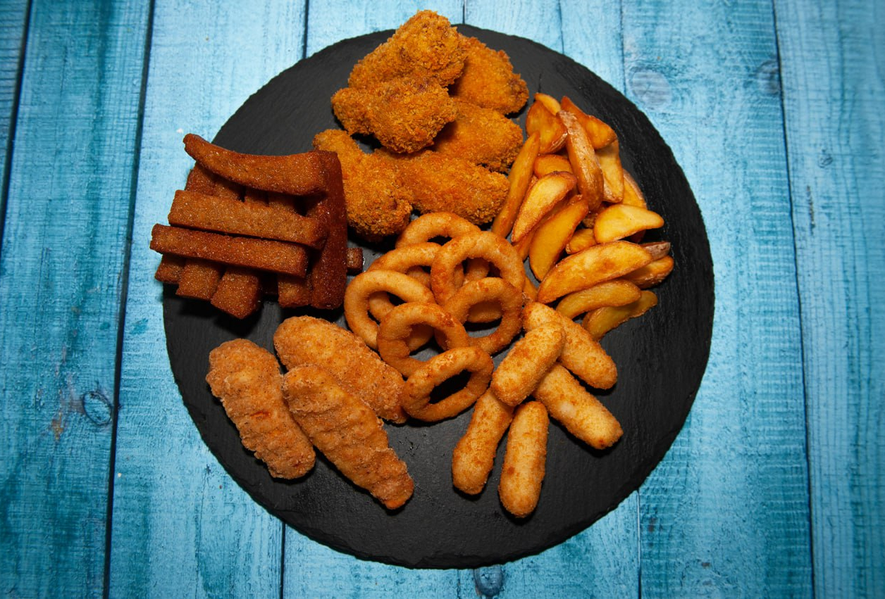 Куриные крылья 6шт., луковые кольца 7шт., куриные стрипсы 3шт., чесночные гренки, сырные палочки 5шт., картофель по-деревенски.